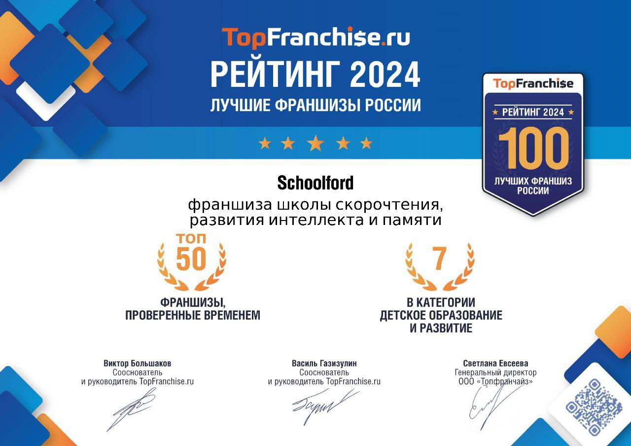 Самый авторитетный портал по франчайзингу в России и странах СНГ TopFranchise.ru в своем ежегодном рейтинге самых надежных, стабильных и перспективных отечественных франшиз включил омскую франшизу школ скорочтения и развития интеллекта в группу лидеров сразу в двух категориях.